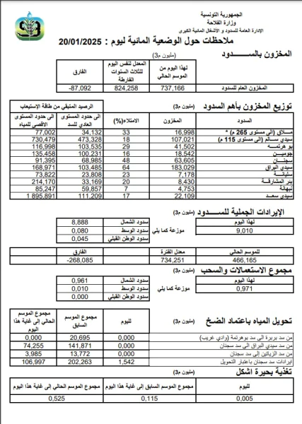 وأظهرت البيانات تفاوتا بين أهم السدود في البلاد، حيث سجّل سد سيدي البراق نسبة 64 بالمائة يليه سد سجنان بـ48 بالمائة ثم سد ملاق بـ33 بالمائة وسد بوهرتمة بـ29 بالمائة وسد سليانة بـ23 بالمائة وسد بئر مشارقة بـ20 بالمائة وسد سيدي سالم بـ18 بالمائة وسد سيدي سعد بـ17 بالمائة وسد جومين بـ16 بالمائة، ليحتل سد نبهانة المرتبة الأخيرة على مستوى مخزون المياه بـ7 بالمائة.