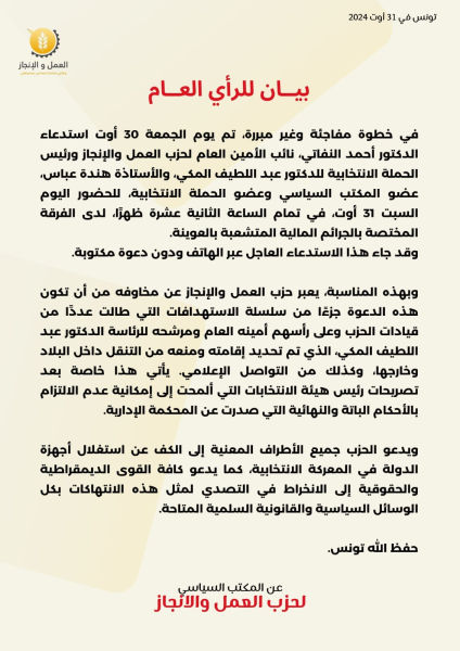 سياسة: تم استدعاء أحمد النفاتي، نائب الأمين العام لحزب العمل والإنجاز ورئيس الحملة الانتخابية لعبد اللطيف المكي، وهندة عباس، عضو المكتب السياسي وعضو الحملة الانتخابية، للحضور اليوم السبت 31 أوت 2024، في تمام الساعة الثانية عشرة ظهرًا، لدى الفرقة المختصة بالجرائم المالية المتشعبة بالعوينة،