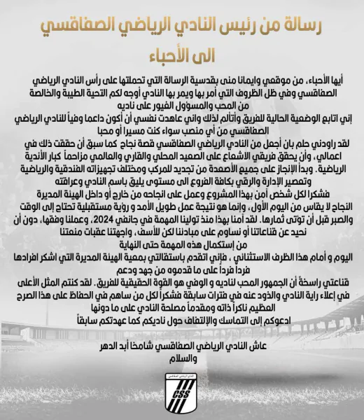 ونشر الفريق بيانا من رئيس النادي عبد العزيز المخلوفي من داخل السجن عبر فيه عن أسفه للوضعية التي يعيشها النادي. وقال البيان إن عدة عقبات منعت إدارة السي أس أس من استكمال المشروع الذي جاءت لأجله قبل نحو سنة. وأضاف المخلوفي أن الجمهور يمثل القوة الحقيقية للفريق داعيا إياه إلى الوقوف خلفه والالتفاف حوله وحمايته. ويعيش النادي الصفاقسي موسما استثنائيا، على جميع المستويات، حيث ساءت نتائجه الرياضية وتأزم وضعه المالي خاصة بعد سجن رئيسه عبد العزيز المخلوفي. وكانت جماهير الصفاقسي، قد نظمت وقفة احتجاجية أمس الثلاثاء طالبت خلالها إدارة النادي بتقديم استقالتها.