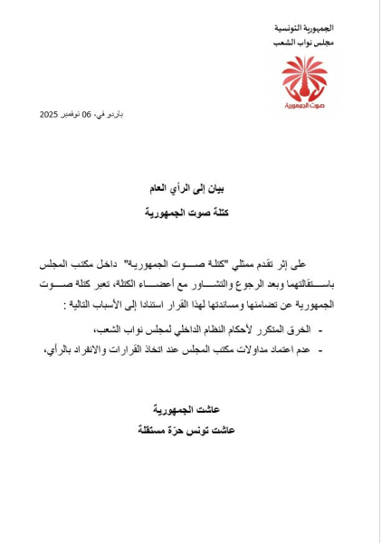 سياسة: أعنلت كتلة صوت الجمهورية بمجلس نواب الشعب في بيان لها الخميس أن ممثليها بمكتب البرلمان قدما استقالتهما من المكتب معبرة عن مساندتها لهذا القرار. قراءة المزيد تونس الان: أعنلت كتلة صوت الجمهورية بمجلس نواب الشعب في بيان لها الخميس أن ممثليها بمكتب البرلمان قدما استقالتهما من المكتب معبرة عن مساندتها لهذا القرار.استقالة مفاجئة لرئيس مستقبل قابسالنجم/ استقالة عضو الهيئة المديرة عادل ڨنوناستقالة نائب من كتلة 'الأمانة والعمل'.. والسبب زميلهالمزيد من الأخبار وأوضحت الكتلة أن ذلك يأتي نظرا للخرق المتكرر لأحكام النظام الداخلي لمجلس نواب الشعب وعدم اعتماد مداولات مكتب المجلس عند اتخاذ القرارات و الانفراد بالرأي ، حسب ما ورد بنص البيان.