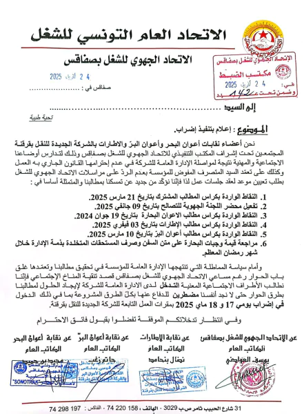 وطنية: أعلن الاتحاد الجهوي للشغل بصفاقس دخول أعوان البحر واعوان البر والاطارات بالشركة الجديدة للنقل بقرقنة في اضراب عن العمل قراءة المزيد أعلن الاتحاد الجهوي للشغل بصفاقس دخول أعوان البحر واعوان البر والاطارات بالشركة الجديدة للنقل بقرقنة في اضراب عن العمل كامل يوم 17 و18 ماي 2025 وذلك احتجاجا على ما اعتبرته المنظمة الشغيلة سياسة المماطلة التي تعتمدها الإدارة العامة للشركة. وتضمنت برقية الاضراب التي نشرها الاتحاد الجهوي للشغل جملة من المطالب المهنية المضمنة في كراس المطالب في فترات مختلفة بالإضافة الى مراجعة قيمة وجبات البحارة على متن السفن وصرف المستحقات المتخلدة بذمة الإدارة.إنقلترا.. آلاف الأطباء يضربون احتجاجا على الأجورانقطاع المياه بسجنان ليومين.. الصوناد توضحمستجدات اضراب موزّعي الأدويةالمزيد من الأخبار