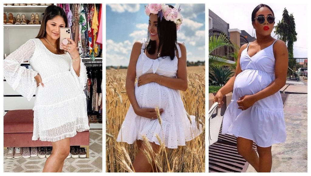 تظل الفساتين البيضاء خيارا رائعا خلال أشهر الحمل. وتناسب كثيراً هذه الأجواء الصيفية بالإضافة إلى أن لونها الفاتح يعبر عن أجواء العيد. ويمكنك اختيارها بقصات وأقمشة متنوعة وتنسيقها أيضاً بطرق مختلفة. فاليوم ستجدينها متوفره بأقمشة القطن، الشيفون، التل، الدانتيل. أما عن القصات فبعضها يأتي بالكشكشة أو بستايل الطبقات. ويمكنك تنسيقها مع اكسسوارات بسيطة الشكل، كنظارة شمس، وسلسلة وخواتم ذهبية أنيقة.