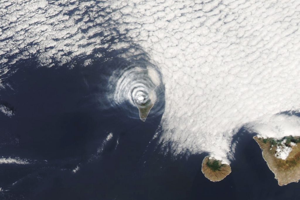 رصدت الأقمار الصناعية مشهدا غريبا من الفضاء لموجات جاذبية في السماء نتجت عن استمرار اندفاع الحمم البركانية من فوهة بركان كامبر فيجا في جزيرة لابالما الإسبانية.