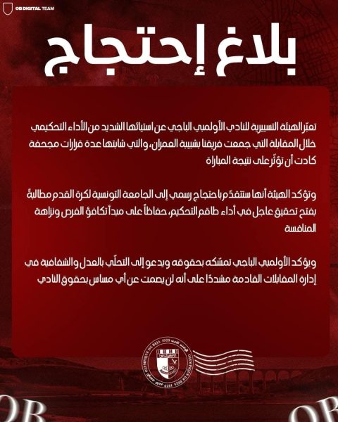 رياضة: هيئة الأولمبي الباجي تطالب بفتح تحقيق عاجل بخصوص طاقم تحكيم المباراة.