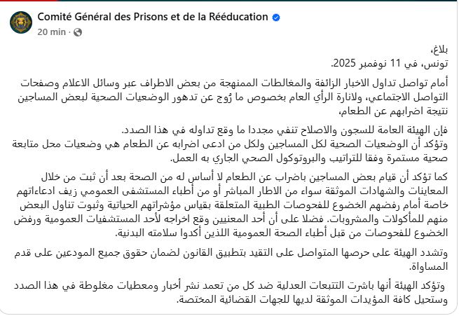 وطنية: أعلنت الادارة العامة للسجون والإصلاح انه "أمام تواصل تداول الاخبار الزائفة والمغالطات الممنهجة من بعض الاطراف عبر وسائل الاعلام وصفحات التواصل الاجتماعي، ولانارة الرأي العام بخصوص ما رُوج عن تدهور الوضعيات الصحية لبعض المساجين نتيجة اضرابهم عن الطعام، فإن فانها تنفي مجددا ما وقع تداوله في هذا الصدد".