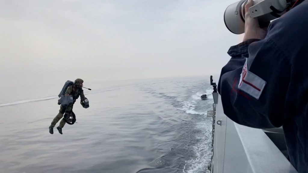 اختبرت البحرية الملكية البريطانية ومشاة البحرية الملكية بدلة نفاثة طورتها شركة «غرافيتي إنداستريز»، حيث تقول «غرافيتي» إن بدلتها يمكن أن تطير بسرعة تصل إلى 130 كيلومتراً في الساعة، على ارتفاع 12 ألف قدم في الهواء، وفق ما ذكر موقع سي إن إن.