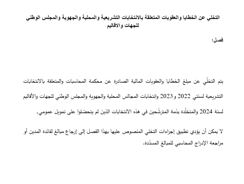 وطنية: صادق نواب البرلمان اليوم الاثنين 2 ديسمبر 2024 ، على فصل إضافي لمشروع قانون المالية لسنة 2025 بـ 60 نعم و22 إحتفاظ و24 رفض. قراءة المزيد صادق نواب البرلمان اليوم الاثنين 2 ديسمبر 2024 ، على فصل إضافي لمشروع قانون المالية لسنة 2025 بـ 60 نعم و22 إحتفاظ و24 رفض. وينص الفصل على “التخلي عن الخطايا والعقوبات المتعلقة بالانتخابات التشريعية والمحلية والجهوية والمجلس الوطني للجهات والاقاليم”.مواصلة الجلسة العامة المشتركة للنّظر في أحكام مشروع قانون الماليةالبرلمان يوافق على تمديد العمل بالمساهمة الاجتماعية التضامنيةالبرلمان/ المصادقة على فصل لتسوية ديون الفلاحينالمزيد من الأخبار