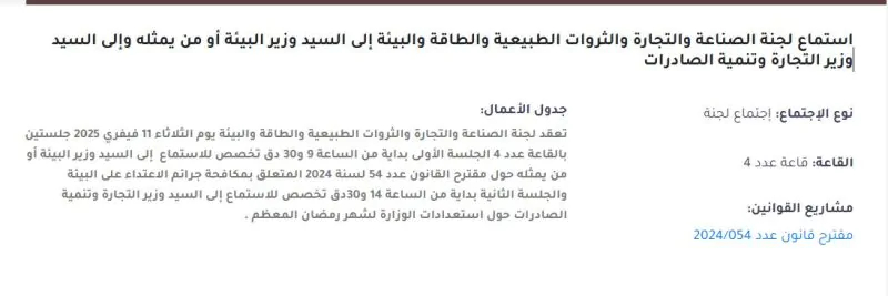 وطنية: تعقد لجنة الصناعة والتجارة والثروات الطبيعية والطاقة والبيئة بالبرلمان يوم الثلاثاء 11 فيفري 2025 جلستين . قراءة المزيد تعقد لجنة الصناعة والتجارة والثروات الطبيعية والطاقة والبيئة بالبرلمان يوم الثلاثاء 11 فيفري 2025 جلستين . وستخصص الجلسة الاولى للاستماع إلى وزير البيئة أو من يمثله حول مقترح القانون عدد 54 لسنة 2024 المتعلق بمكافحة جرائم الاعتداء على البيئة .البرلمان/ المصادقة على قانون المالية 2026البرلمان يوافق على تمديد العمل بالمساهمة الاجتماعية التضامنيةالبرلمان/ المصادقة على فصل لتسوية ديون الفلاحينالمزيد من الأخبار وستخصص الجلسة الثانية للاستماع إلى وزير التجارة وتنمية الصادرات حول استعدادات الوزارة لشهر رمضان المعظم .
