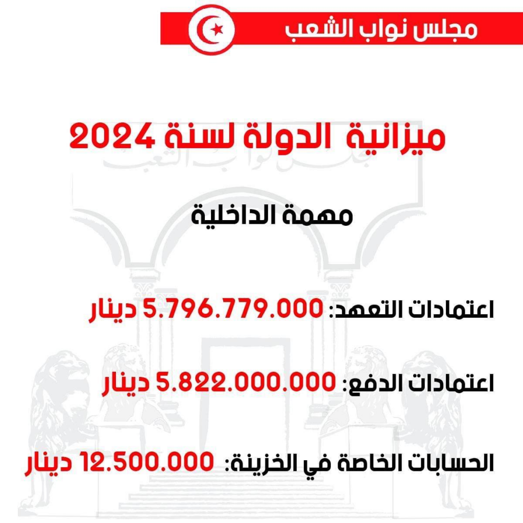 وطنية : تمّ عشية اليوم الثلاثاء 21 نوفمبر 2023، المصادقة على ميزانية وزارة الداخلية بموافقة 140 نائبا، واحتفظ 7 نواب بأصواتهم ورفض نائب واحد الميزانية قراءة المزيد تمّ عشية اليوم الثلاثاء 21 نوفمبر 2023، المصادقة على ميزانية وزارة الداخلية بموافقة 140 نائبا، واحتفظ 7 نواب بأصواتهم ورفض نائب واحد الميزانية يذكر أنّ الميزانية قدرت بـ 5796 مليون دينار و779 ألف.