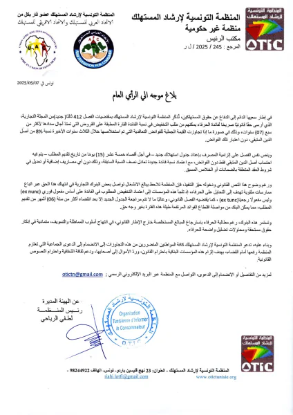 ودعت المنظمة التونسية لإرشاد المستهلك كافة المواطنين المتضررين من هذه التجاوزات إلى الانضمام إلى الدعوى الجماعية التي تعتزم المنظمة رفعها أمام القضاء، بهدف إلزام هذه المؤسسات البنكية باحترام القانون، وردّ الأموال إلى أصحابها، ودعم ثقافة الشفافية واحترام النصوص القانونية.
