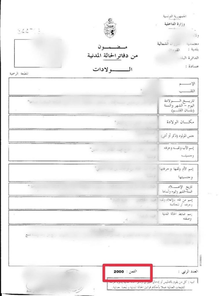 وأعلنت أن معلوم استخراج مضمون ولادة هو في حدود 500 مليم حسب ما تم ضبطه بموجب الأمر الحكومي عدد 805 لسنة 2016 المؤرخ في 13 جوان 2016 المتعلق بضبط تعريفة المعاليم المرخص للجماعات المحلية في استخلاصها.
