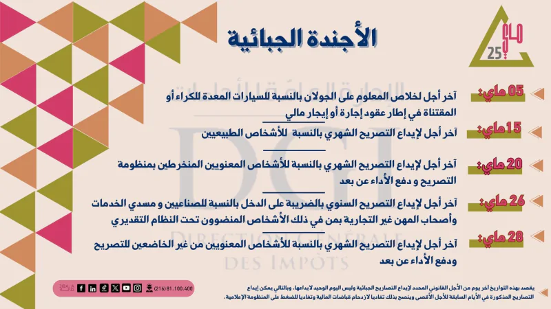 كما حُدّد يوم الـ26 ماي 2025، كـآخر أجل لإيداع التصريح السنوي بالضريبة على الدخل بالنسبة للصناعيين ومسدي الخدمات وأصحاب المهن غير التجارية، بمن في ذلك الأشخاصُ المنضوُون تحت النظام التقديري، ويوم 28 ماي آخر أجل لإيداع التصريح الشهري بالنسبة للأشخاص المعنويين من غير الخاضعين للتصريح ودفع الأداء عن بُعد.