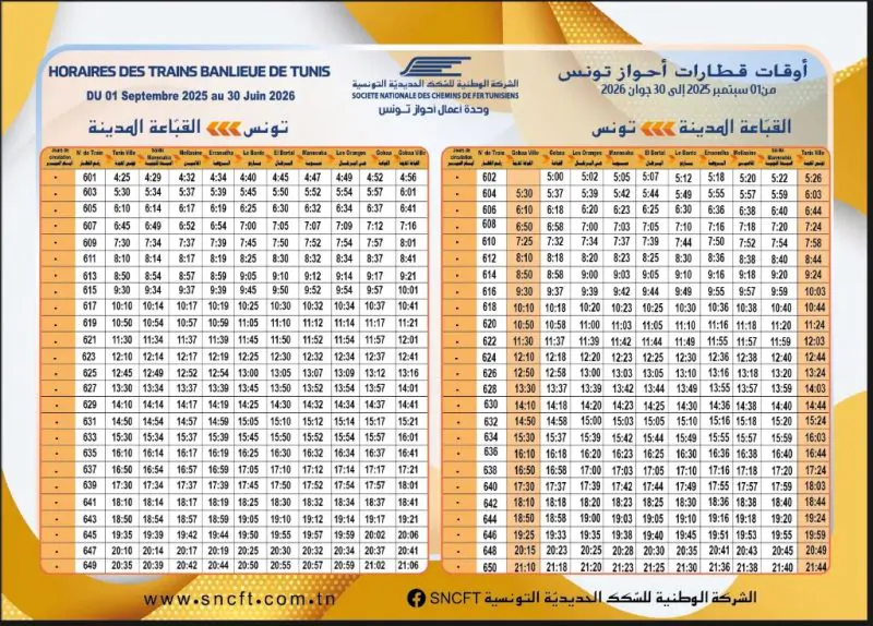 أوقات القطارات: نشرت الشركة التونسية للسكك الحديدية أوقات قطارات أحواز تونس و أحواز الساحل من 01 سبتمبر 2025 إلى 30 جوان 2026 باستثاء شهر رمضان