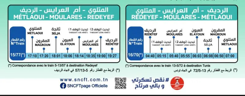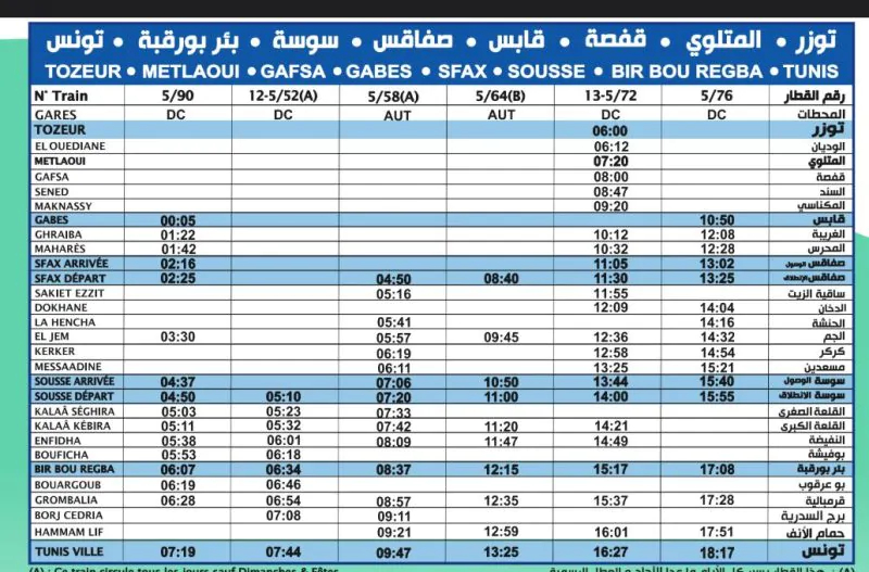 أوقات القطارات: نشرت الشركة التونسية للسكك الحديدية أوقات قطارات الخطوط البعيدة من 1 سبتمبر 2025 إلى 30 جوان 2026 باستثناء شهر رمضان