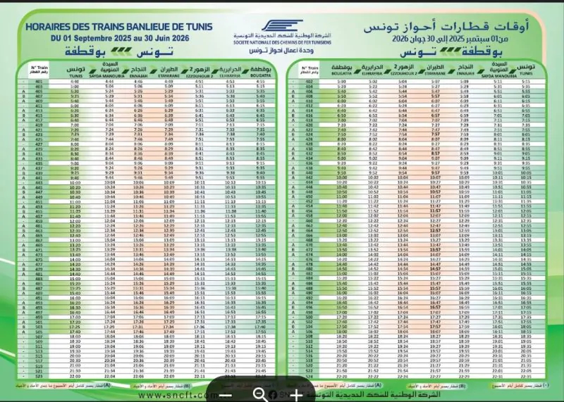 أوقات القطارات: نشرت الشركة التونسية للسكك الحديدية أوقات قطارات أحواز تونس و أحواز الساحل من 01 سبتمبر 2025 إلى 30 جوان 2026 باستثاء شهر رمضان