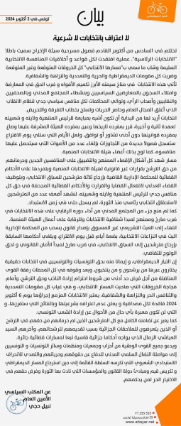 وابرز ان قراره بعدم الاعتراف بنتائج الانتخابات يأتي لـ””فجاجة الخروقات التي صاحبت المسار الانتخابيّ، و في غياب كلّ مقوّمات التعدّديّة والتنافس الحر والنزاهة والشفافية، يعتبر الانتخابات المزمع إجراؤها يوم 6 أكتوبر 2024 فاقدة لكل مصداقية و يعلن عدم اعترافه بشرعيتها وبالنتائج التي ستفرزها، و التي لن تكون معبّرة بأي حال من الأحوال عن إرادة الشعب التونسي”.