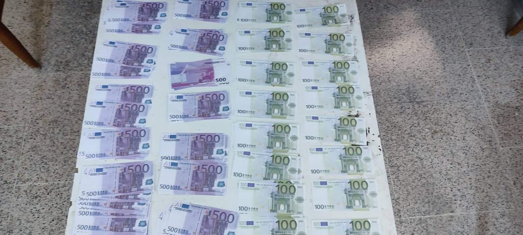 وبالتنسيق مع النيابة العمومية بقرمبالية ومداهمة منزل المظنون فيه بمعاضدة أعوان فرقة شرطة النجدة بالحمامات وبتفتيش المنزل امكن حجز مبلغ مالي هام من العملة الاجنبية المزيفة من فئتي 100 اورو و 500 اورو .