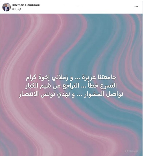 رياضة: أعلن تراجعه عن استقالته من الجامعة التونسية لكرة القدم وذلك عبر تدوينة نشرها على حسابه الشخصي على فيسبوك. قراءة المزيد أعلن خميس الحمزاوي، عضو المكتب الجامعي تراجعه عن استقالته من الجامعة التونسية لكرة القدم وذلك عبر تدوينة نشرها على حسابه الشخصي على فيسبوك. تغيير موعد كلاسيكو الترجي والنادي الصفاقسيتمديد وقف إطلاق النار بين لبنان وإسرائيلرئيس الدولة: 'قريباً إرساء المجلس الأعلى للتربية والتعليم' (فيديو)المزيد من الأخبار