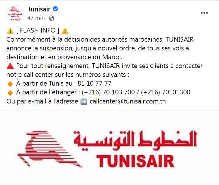 أعلنت شركة الخطوط التونسية، اليوم الإثنين، أنه تبعا لقرار السلطات المغربية، فإنها قررت تعليق جميع رحلاتها من وإلى المغرب حتى إشعار آخر.