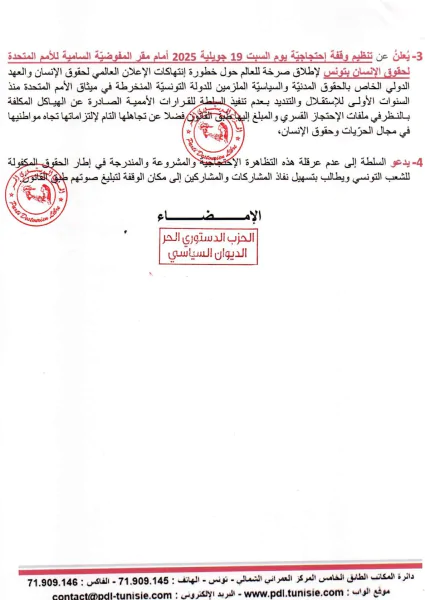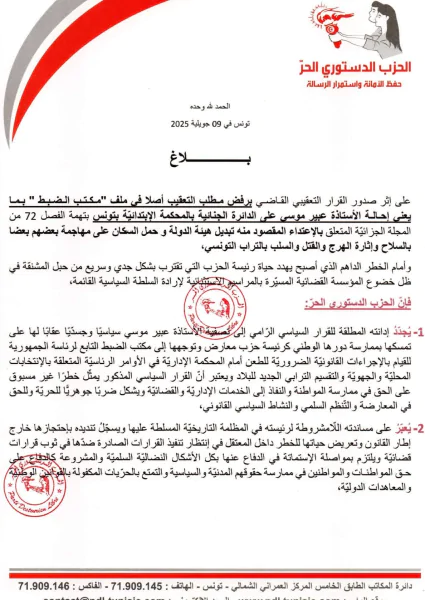 وجدّد الحزب إدانته المطلقة لما اعتبره “قرارا سياسيا يرمي إلى تصفية موسي سياسيا وجسديا عقابًا لها على تمسكها بممارسة دورها الوطني كرئيسة حزب معارض وتوجهها إلى مكتب الضبط التابع لرئاسة الجمهورية للقيام بالإجراءات القانونيّة الضروريّة للطعن أمام المحكمة الإداريّة في الأوامر الرئاسيّة المتعلقة بالانتخابات المحليّة والجهويّة والتقسيم الترابي الجديد للبلاد”. كما اعتبر أنّ “القرار السياسي المذكور يمثّل خطرًا غير مسبوق على الحق في ممارسة المواطنة والنفاذ إلى الخدمات الإداريّة والقضائيّة، ويشكل ضربًا جوهريًّا للحريّة وللحق في المعارضة والتّنظم السلمي والنشاط السياسي القانوني”. وينصّ الفصل 72 من المجلة الجزائية، على أنه ” يعاقب بالإعدام مرتكب الاعتداء المقصود منه تبديل هيئة الدولة أو حمل السكان على مهاجمة بعضهم بعضا بالسلاح وإثارة الهرج والقتل والسلب بالتراب التونسي“. وأعلن الحزب عن تنظيم وقفة احتجاجيّة يوم السبت 19 جويلية 2025 أمام مقر المفوضيّة السامية للأمم المتحدة لحقوق الإنسان بتونس، “للتنبيه إلى خطورة انتهاكات الإعلان العالمي لحقوق الإنسان والعهد الدولي الخاص بالحقوق المدنيّة والسياسيّة الملزمين للدولة التونسيّة، وللتنديد بعدم تنفيذ السلطة للقـرارات الأممية الصادرة عن الهياكل المكلفة بـالنظر في ملفات الاحتجاز القسري والمبلغ إليها طبق القانون” ، حسب نص البيان. يذكر أن رئيسة الحزب الدستوري الحر عبير موسي، مودعة بالسجن منذ 3 أكتوبر 2023 على ذمّة عدد من القضايا، من بينھا قضيّتان رفعتھما ضدّھا الھيئة العليا المستقلة للانتخابات، إلى جانب قضية ما يعرف بـ”مكتب الضبط” التابع لرئاسة الجمهورية، وأخرى رفعتها ضدها منظمة الدفاع عن المعتقدات والمقدّسات ومناهضة التطرّف والإرهاب.