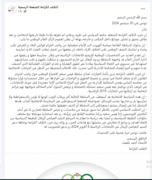 و استنكر حزب ائتلاف الكرامة بأشدّ العبارات، ما وصفه بـ”تحدّي سلطة قيس سعيّد الإجماع الوطني حول واجب احترام القانون الذي ينظم الحياة في تونس ويضبط الحقوق والواجبات بين أفرادها، من خلال استصداره قرارًا مشوّهًا من مجلسه النيابي يقصي المحكمة الإدارية من النظر في النزاع الانتخابي أيّامًا معدودة قبل موعد الانتخابات، في الوقت الذي يواصل فيه قيس سعيّد تمسّكه بالحصانة ويرفض المثول أمام المحاكم لمواجهة تهم جرائم انتخابية تم ارتكابها في انتخابات 2019 الرئاسية”.