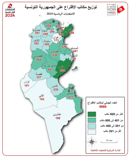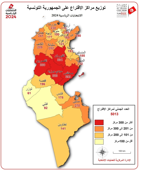 وبيّنت في بلاغ أنّ الانتخابات الرّئاسيّة المقرّر عقدها يوم 6 أكتوبر 2024 ستجرى في 5013 مركز اقتراع و9669 مكتب اقتراع موزّعة على كامل ولايات الجمهوريّة كالآتي: