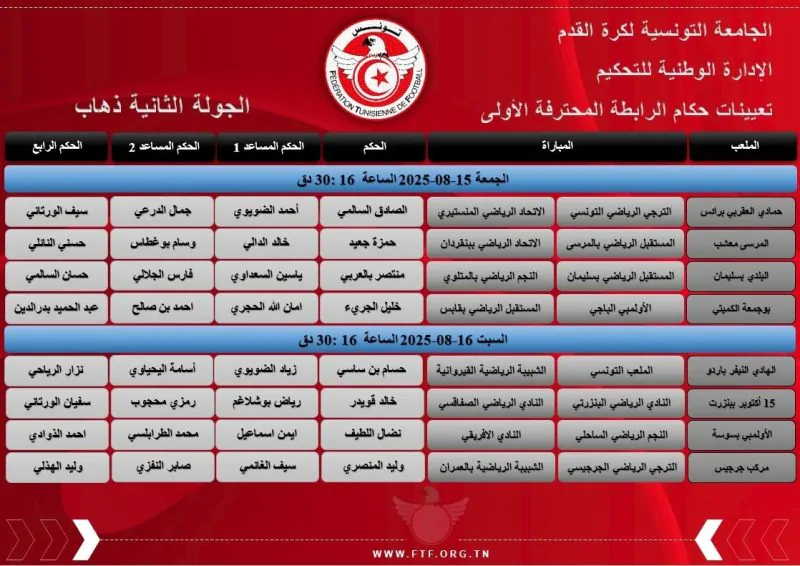 رياضة: حكام الجولة الثانية من الرابطة الأولى التي ستقام على دفعتين. قراءة المزيد كشفت الادارة الوطنية للتحكيم اليوم الاربعاء عن حكام الجولة الثانية من الرابطة الأولى التي ستقام على دفعتين يومي الجمعة والسبت 15 و 16 أوت 2025. وفي ما يلي تعيينات حكام مباريات الجولة الثانية من البطولة:تقرير: ثلث مسلمي فرنسا يُعانون من التمييزكأس إيطاليا/ لاتسيو يقصي ميلانقوات أبو شباب تحسم الجدل وتكشف كيفية مقتلهالمزيد من الأخبار