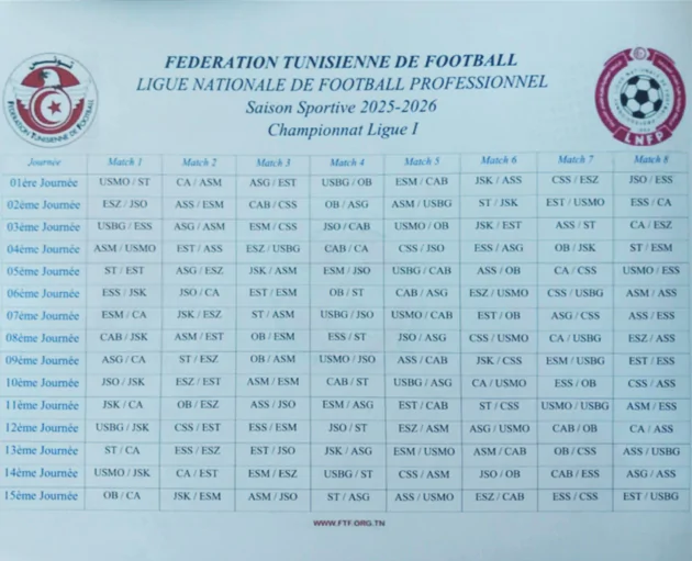 تم اليوم السبت 19 جويلية 2025 سحب رزنامة بطولة الرابطة المحترفة الاولى للموسم الرياضي 2025 – 2026 بقاعة الندوات بالإدارة الفنية الوطنية بمقر الجامعة التونسية لكرة القدم وبحضور ممثلي الجمعيات الرياضية.