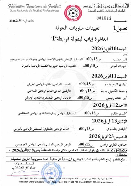 اعلنت الرابطة الوطنية لكرة القدمالمحترفة اليوم الثلاثاء عن تغيير مواعيد بعض مقابلات الجولة العاشرة اياب من بطولة الرابطة الأولى, و في ما يلي البرنامج الكامل: