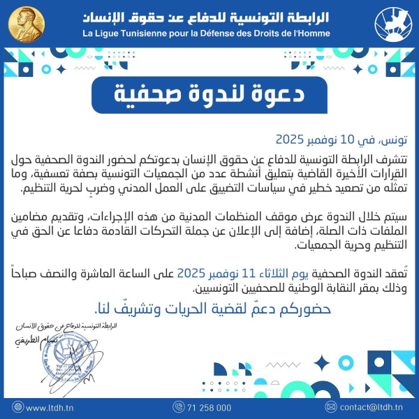 من المنتظر ان تنظم الرابطة التونسية للدفاع عن حقوق الإنسان ندوة صحفية حول القرارات الأخيرة القاضية بتعليق أنشطة عدد من الجمعيات التونسية بـصفة وصفتها الرابطة بالـ”تعسفية”، وبسبب ما اعتبرته الرابطة ” تصعيد خطير في سياسات التضييق على العمل المدني وضربٍ لحرية التنظيمé.