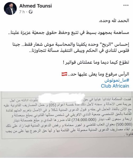 قضت المحكمة الابتدائية بتونس غيابيا بسجن رئيس سابق بالنادي الإفريقي لمدة 5 سنوات وتغريمه بمبلغ 774 ألف دينار لصالح الفريق، وفق تدوينة نشرها المحامي أحمد التونسي عبر حسابة الشخصي على فيسبوك.