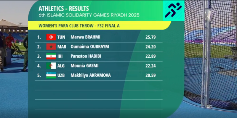 رياضة: تُوجت اليوم الأربعاء 19 نوفمبر 2025، البطلة التونسية البارالمبية والعالمية وصاحبة الرقم العالمي مروى البراهمي، بالميدالية الذهبية لرمي الصولجان في المنافسات البارالمبية لألعاب القوى في إطار الدورة السادسة لألعاب التضامن الإسلامي.