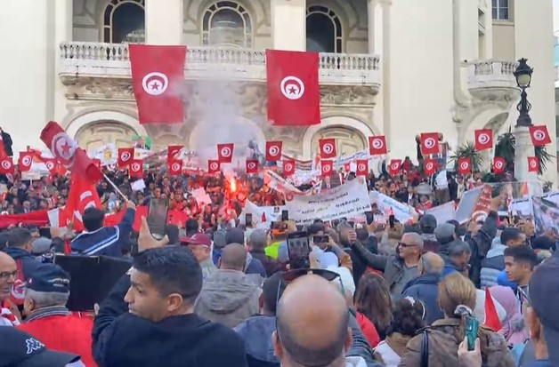 ورفع المشاركون لافتات وشعارات تطالب بالمحاسبة والدفاع عن استقلال القرار الوطني، وسط أجواء مشحونة بالحماس والتعبير الشعبي، تعكس استمرار الروح الثورية بين التونسيين.