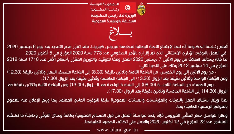 أعلنت وزارة الوظيفة العمومية في بلاغ لها أنه تقرر إيقاف العمل بالتوقيت الإداري الاستثنائي وسيتم الانطلاق في اعتماد التوقيت الإداري العادي بداية من يوم الإثنين 7 ديسمبر 2020.