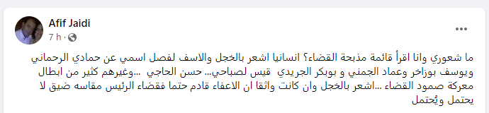 وعبر الجعايدي في تدوينة على الفايسبوك عن خجله لعدم ادراج اسمه في القائمة وقال “انسانيا اشعر بالخجل والاسف لفصل اسمي عن حمادي الرحماني ويوسف بوزاخر وعماد الجمني و بوبكر الجريدي قيس لصباحي… حسن الحاجي …وغيرهم كثير من ابطال معركة صمود القضاء”.