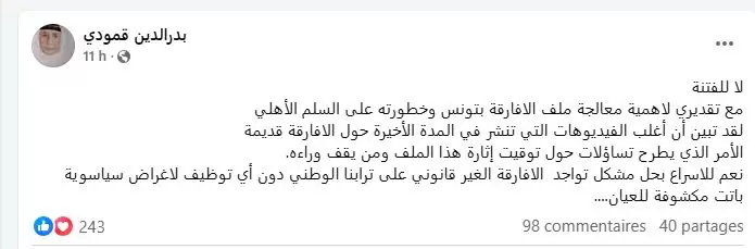 دعا النائب في البرلمان بدر الدين القمودي إلى التعامل بحذر مع ملف المهاجرين غير النظاميين في تونس، محذّرًا من استغلاله بشكل يهدد السلم الأهلي، وذلك في منشور له على حسابه الرسمي بموقع فيسبوك.