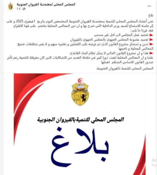 قرر اعضاء المجلس المحلي للتنمية بمعتمدية القيروان الجنوبية المجتمعين اليوم بتاريخ 1فيفيري 2025 و "على إثر جلسة الاستماع لوزير الداخلية التي صرح بها و ان دور المجالس المحلية يختصر على قوة الاقتراح تجميد عمل المجلس الى اجل غير مسمى"