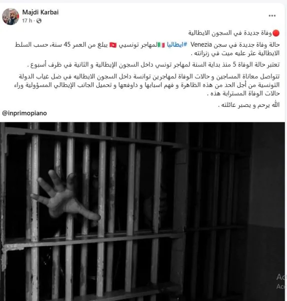 وطنية: أكد الناشط في المجتمع المدني المقيم في إيطاليا والنائب السابق بالبرلمان، مجدي الكرباعي، وفاة مهاجر تونسي يبلغ من العمر 45 سنة داخل زنزانته في أحد السجون الإيطالية.