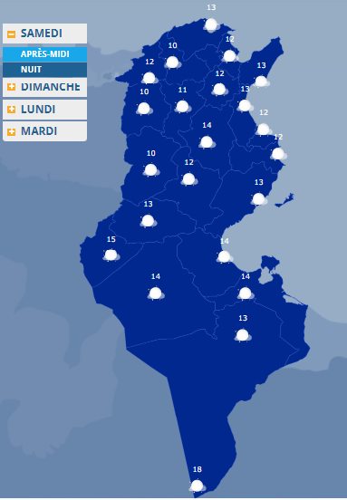 أفاد المعهد الوطني للرصد الجوي في بلاغ له حول تطورات الطقس، اليوم السبت، بأن الطقس سيتواصل في استقرار في الفترات القادمة، حيث تكون السماء مغشاة بسحب مرتفعة في أغلب الجهات مع درجات حرارة ليلية تتراوح بين 10 و 15 درجة في أغلب الجهات وتصل محليا 18 درجة بأقصى الجنوب، ومع هبوب رياح غربية سرعتها ضعيفة فمعتدلة وتكون قوية نسبيا قرب السواحل الشمالية.