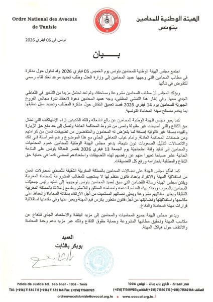 أعلن مجلس الهيئة الوطنية للمحامين عن تنفيذ وقفة احتجاجية يوم الجمعة 13 فيفري 2026 بقصر العدالة بتونس على الساعة 11 صباحًا، احتجاجًا على ما وصفه بـ التضييقات المستمرة على ممارسة مهنة المحاماة وغياب الاستجابة من وزارة العدل.