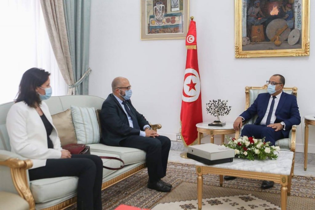 رئيس الحكومة هشام المشيشي اليوم الجمعة 2 أكتوبر 2020 بقصر الحكومة بالقصبة رئيس هيئة المهندسين المعماريين محمد صحبي القرجي والكاتبة العامة للهيئة ريم زعبار .