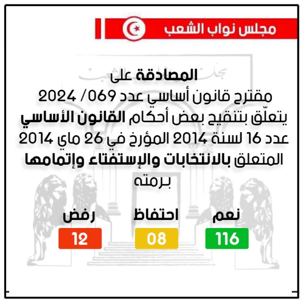 فقد تم وفق البلاغ، التصويت على مقترح قانون أساسي عدد 069/ 2024 يتعلّق بتنقيح بعض أحكام القانون الأساسي عدد 16 لسنة 2014 المؤرخ في 26 ماي 2014 المتعلق بالانتخابات والإستفتاء وإتمامها بـ 116 نعم 08 إحتفاظ و12 رفض.