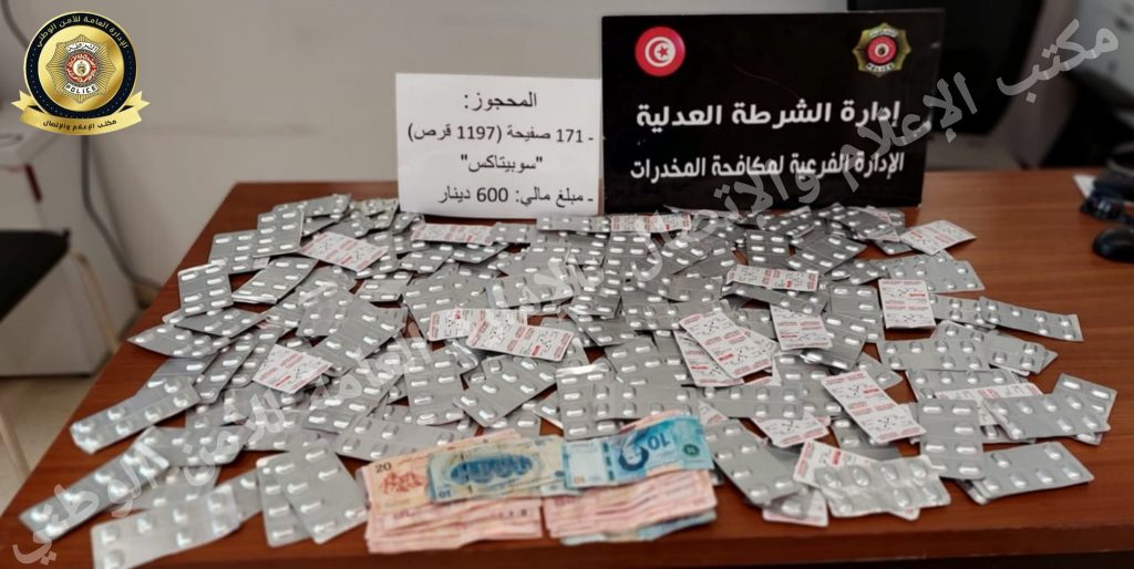 تمكّنت الوحدات الأمنية التابعة للإدارة الفرعية لمكافحة المخدّرات بإدارة الشرطة العدليّة إثر مداهمة أمنية قانونية على منزل أحد مروّجي المخدّرات بجهة الملاسين من حجز عدد 1197 قرص مخدّر نوع “سوبيتاكس” بقيمة 53 ألف دينار ومبلغ مالي قدره 600 دينار من عائدات الترويج.