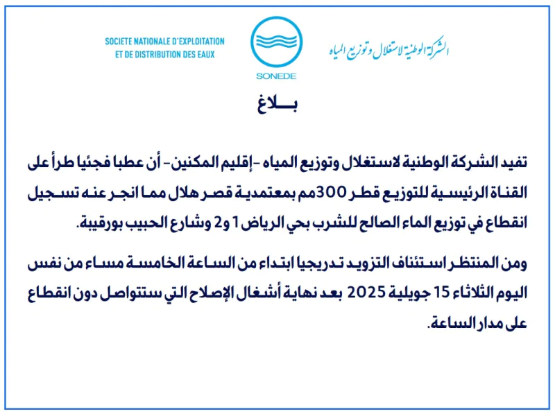 وطنية: أعلنت الشركة الوطنية لاستغلال وتوزيع المياه - إقليم المكنين - بولاية المنستير، عن تسجيل انقطاع في توزيع الماء الصالح للشرب بحي الرياض 1 و 2 وشارع الحبيب بورقيبة وذلك على اثر عطب فجئي طرأ على القناة الرئيسية للتوزيع قطر 300 مم بمعتمدية قصر هلال