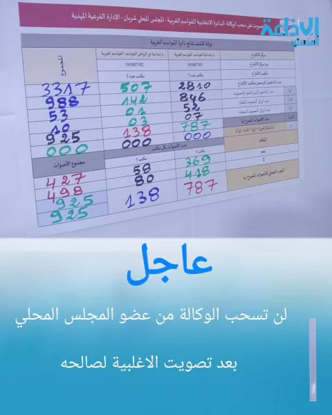 وطنية: أسفرت عملية فرز الأصوات على سحب الوكالة من عضو مجلس محلي بمنطقة القواسم الغربية، بمعتمدية شربان من ولاية المهدية، والتي جرت يوم أمس الأحد 28 سبتمبر، إلى فوز النائب المعني بسحب الوكالة بعد حصوله على 498 صوت رافض لسحب الوكالة منه مقابل 428 صوت لسحب الوكالة