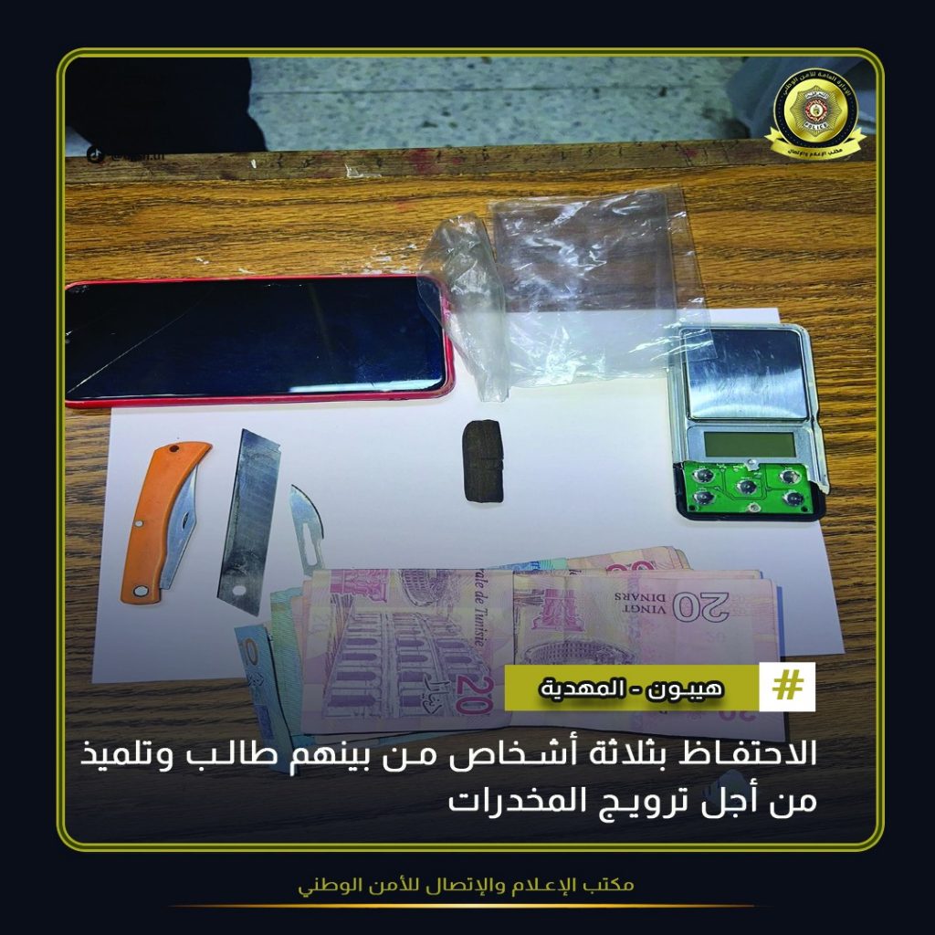 توفرت معلومات لدى مركز الأمن الوطني بهيبون مفادها تعمد أحد الاشخاص (متربص بالتكوين المهني) ترويج مخدر القنب الهندي لعديد الأشخاص، بتعميق التحريات والتنسيق مع ممثل النيابة العمومية تم التحول الى منزل المعني والقبض عليه وبرفقته أحد أصدقائه (طالب).