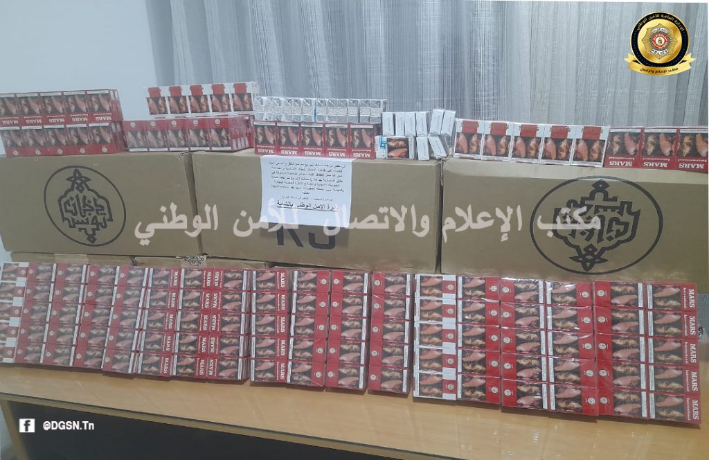 وتم للغرض نصب كمين محكم للمعنيين وايقاف سيارتهما اللتان بتفتيشهما عثر داخل السيارة الأولى على عدد 1000 علبة سجائر متأتية من خارج مسالك التوزيع والمقدر ثمنها بـ 2200 دينار، كما عثر بداخل الثانية على عدد 2480 علبة سجائر دون فواتير تثبت سلامة مصدرها والمقدر ثمنها بـ 3500 دينار.