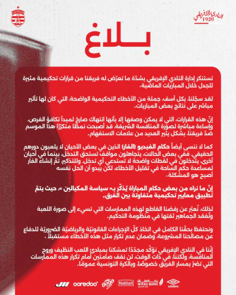 رياضة: إنتقد النادي الإفريقي في بلاغ رسمي صادر عن الصفحة الرسمية للفريق القرارت التحكيمية في المقابلات الأخيرة قراءة المزيد إنتقد النادي الإفريقي في بلاغ رسمي صادر عن الصفحة الرسمية للفريق القرارت التحكيمية في المقابلات الأخيرة وقال النادي الإفريقي في بلاغه ان بعض الحكام يعتمدون سياسة المكيالين حيث يتم تطبيق معايير تحكيمية متفاوتة بين مختلف الفرقسعيّد يستدعي سفير الاتحاد الأوروبي ويحتجّ على خرقه الأعراف الدبلوماسيةحاملو شهادة الدكتوراه يحتجّون أمام البرلمانإنقلترا.. آلاف الأطباء يضربون احتجاجا على الأجورالمزيد من الأخبار يشار إلي ان النادي الإفريقي يحتل حالياً المرتبة الثالثة برصيد 16 نقطة على بعد نقطة من المتصدر الملعب التونسي