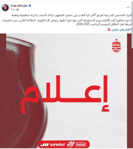 رياضة:  أعلن النادي الإفريقي، اليوم الأربعاء 30 جويلية 2025، أن تدريبات فريق أكابر كرة القدم تُجرى دون حضور الجمهور، وذلك لأسباب إدارية وتنظيمية وتقنية.