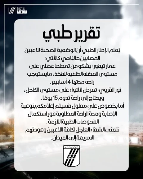 رياضة: كشف النادي الصفاقسي في بلاغ له عبر موقعه الرسمي على الفايسبوك عن الحالة الصحية للاعبيه المصابين قراءة المزيد كشف النادي الصفاقسي في بلاغ له عبر موقعه الرسمي على الفايسبوك عن الحالة الصحية للاعبيه المصابين التي جاءت كالآتي :إنطلاق بيع تذاكر مباراة النجم والنادي الصفاقسياستئصال جزء من الكلى.. تامر حسني يكشف تفاصيل حالته الصحيةالنادي الصفاقسي/ اجتماع اللجنة العليا للدعم لتشكيل هيئة تسييريةالمزيد من الأخبار